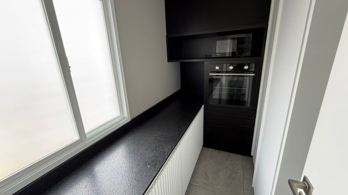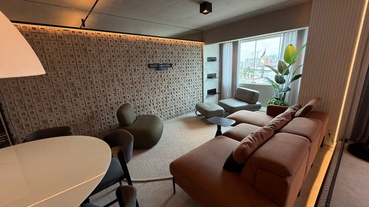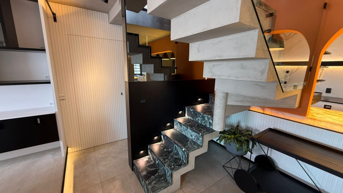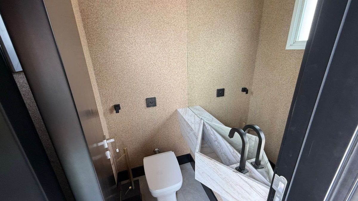 No primeiro pavimento, o living é integrado ao home office, criando um espaço funcional para o dia a dia. A cozinha completa é acompanhada de lavanderia e despensa. O pavimento possui ainda lavabo e uma suíte master com dois banheiros privativos.